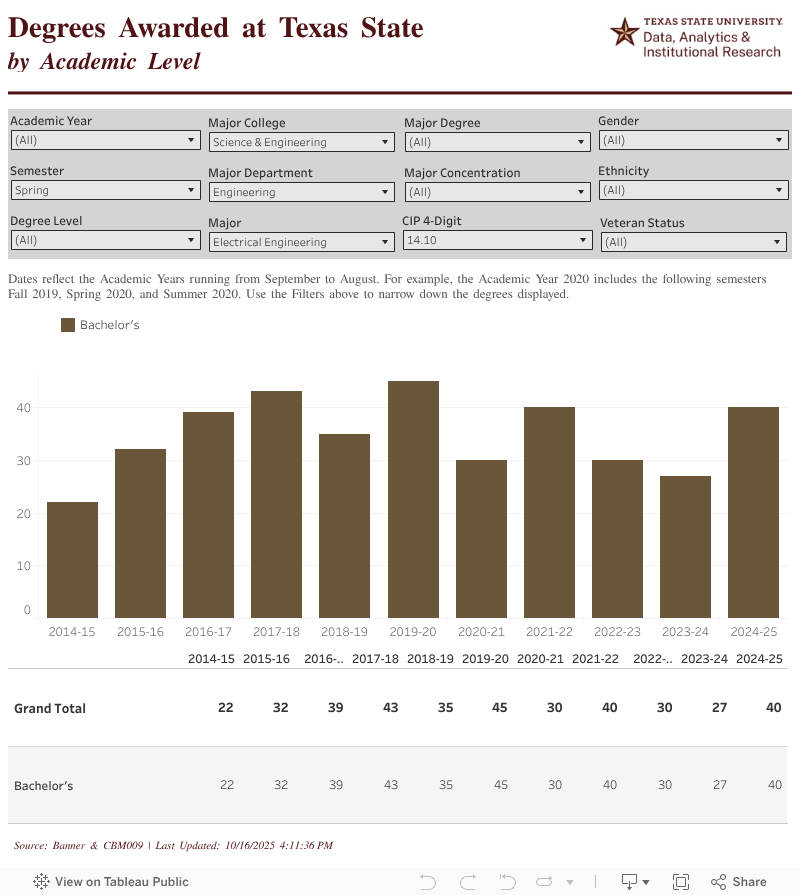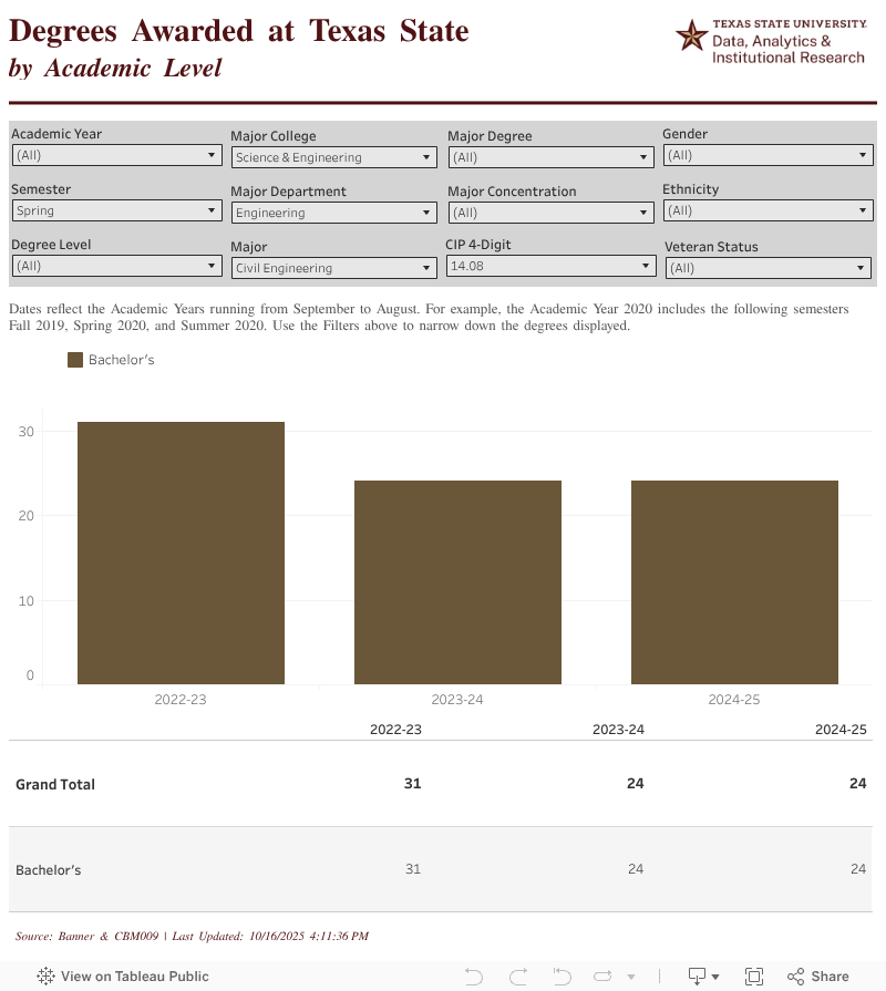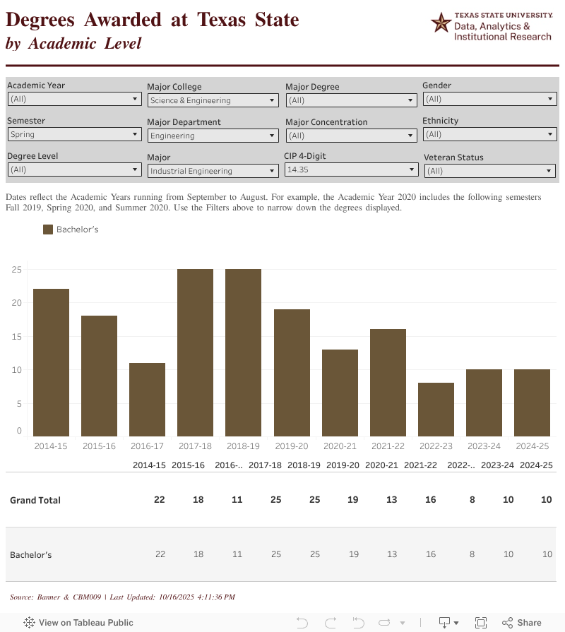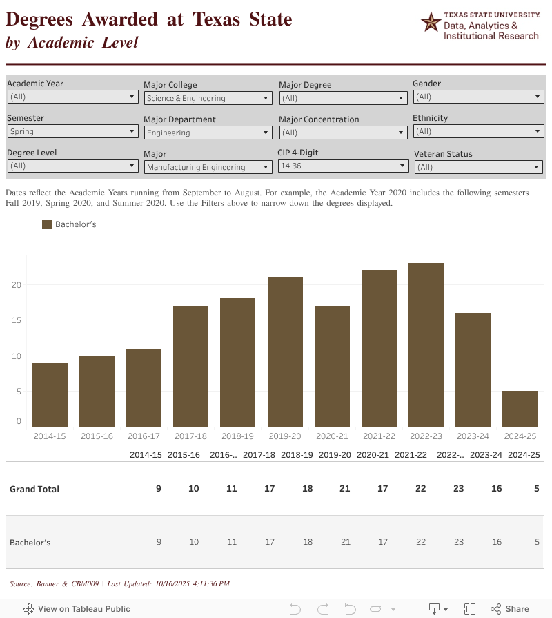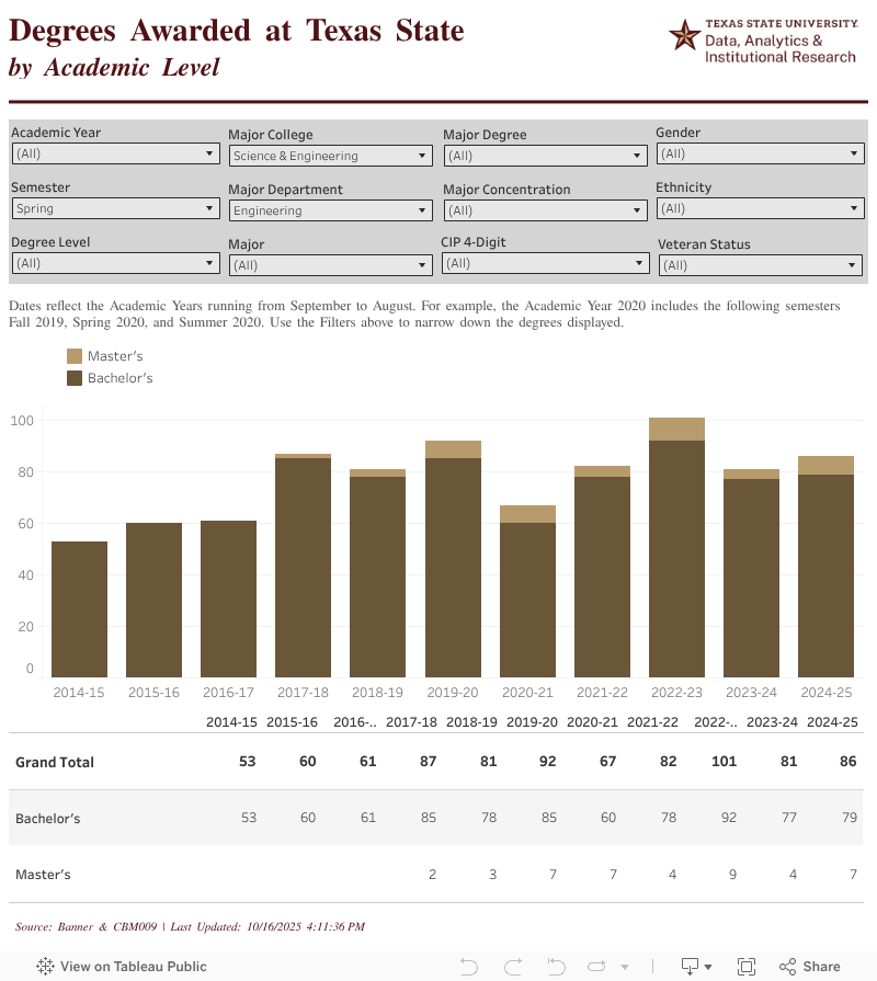 Note: The Ingram School of Engineering's Mechanical Engineering program is at the start of it's fourth year. Thus, there is no graduation data available at this time.